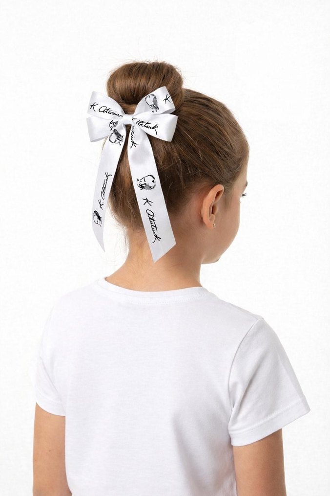 Beyaz sentetik kumaştan yapılmış, baskılı detaylara sahip bu fiyonk saç aksesuarı, sade saçlara Paris sokak modası dokunuşu katıyor.