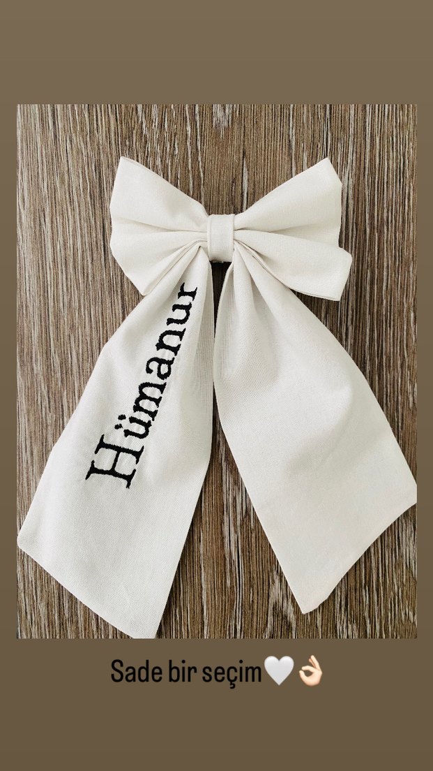 Beyaz fiyonk saç aksesuarı, sade ve düz bir stile sahip. İsimli nakışıyla temel ve şık bir seçim.
