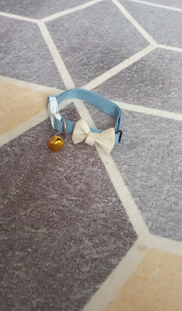 Pastel mavi renkte, beyaz fiyonk ve küçük bir çan içeren kedi boyunluğu. Rahat ve şık tasarım.