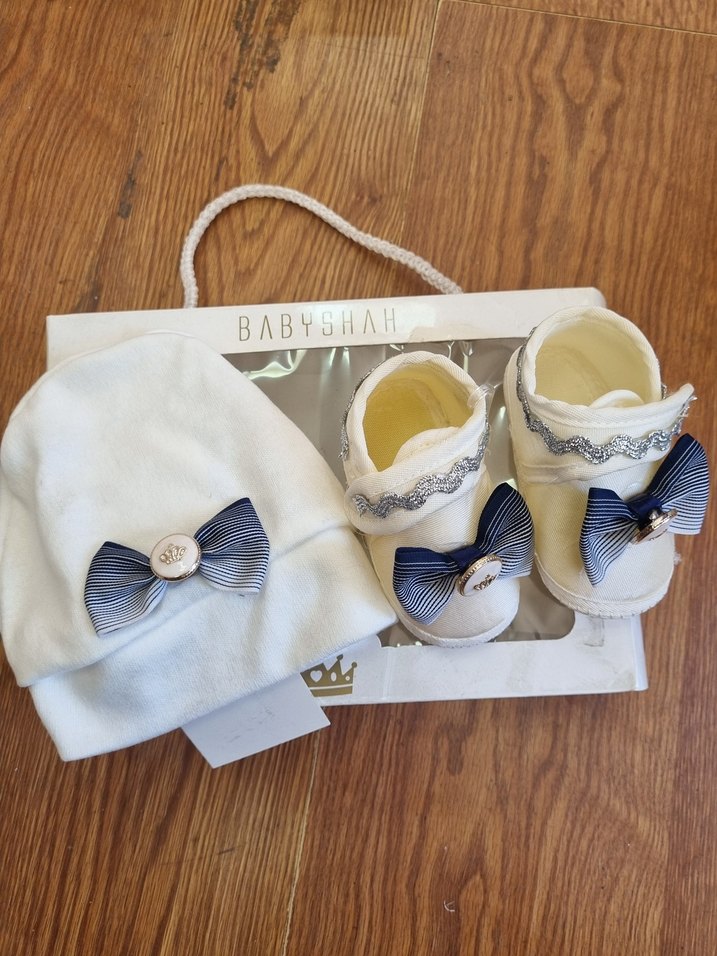 0-2 ay arası yeni doğan Beyaz patik ve şapka seti, lacivert çizgili fiyonk ve zarif nakış detaylarıyla süslenmiştir. BABYSHA markası bulunur.