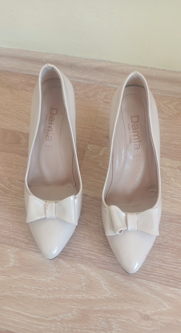 Beyaz renkte, blok topuklu kadın stiletto. Üzerinde fiyonk detayı bulunan, kauçuk malzemeden yapılmıştır. Günlük kullanıma uygundur. Marka: Damia.