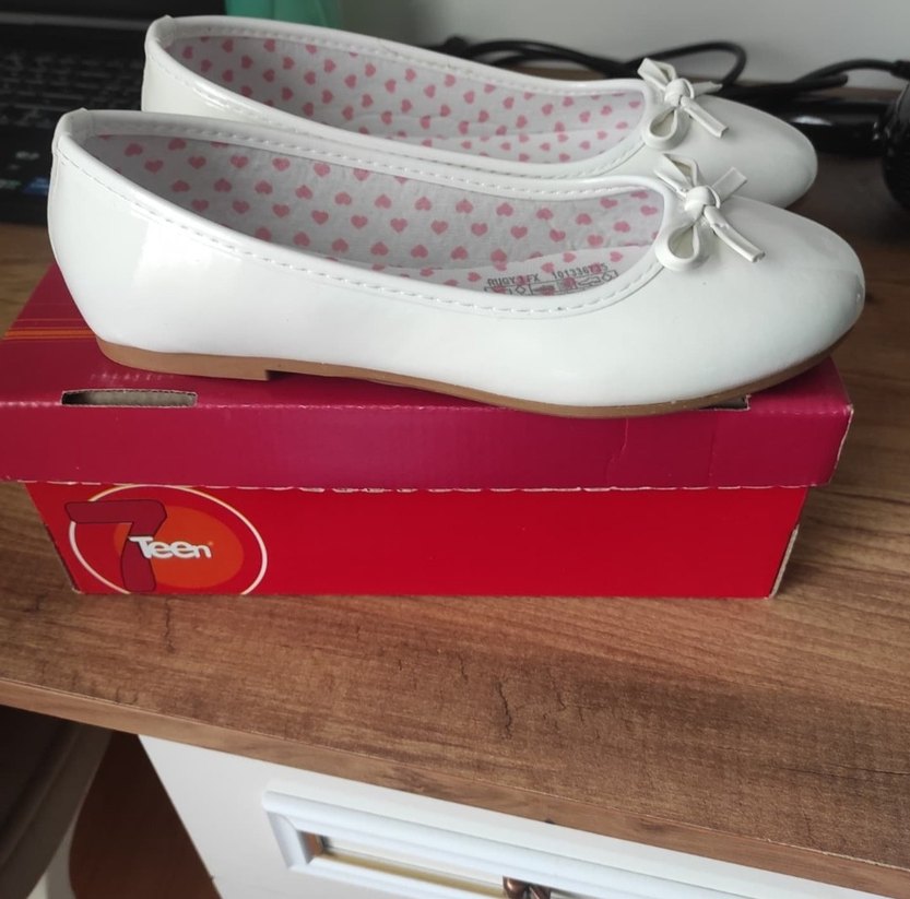 Beyaz fiyonklu kız babet ayakkabı, kauçuk malzemeden üretilmiş, renkli kalp desenli iç astara sahip. Sade ve klasik tarzda.