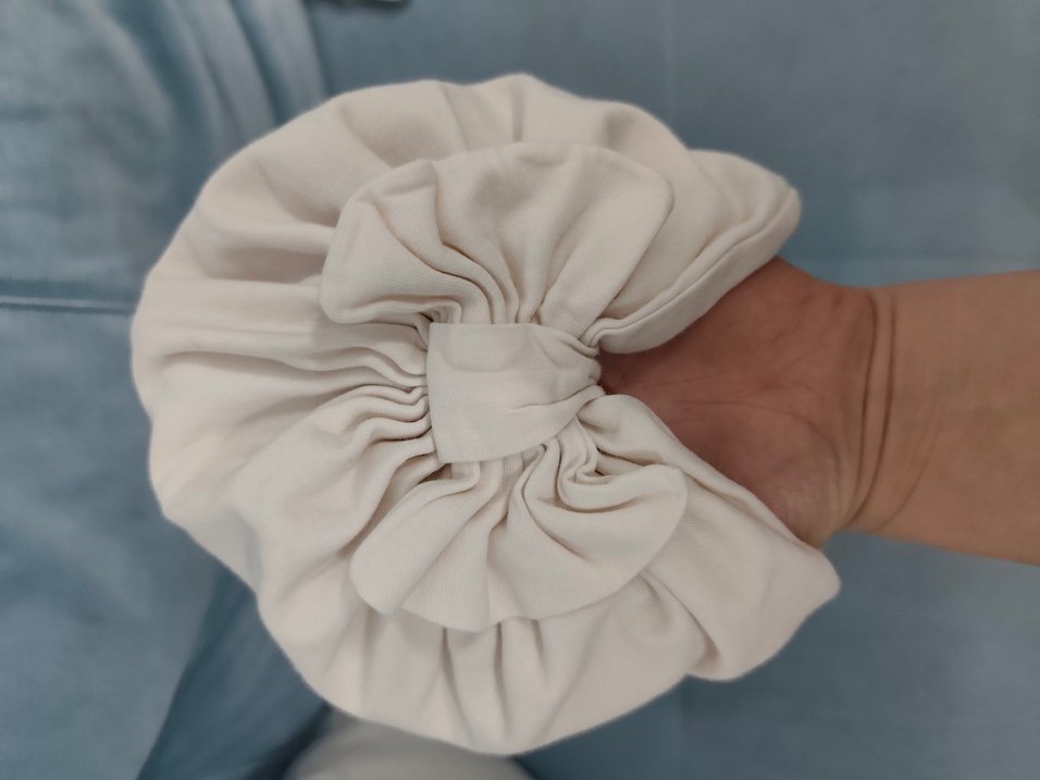 Yumuşak kumaş ve toplanmış tasarıma sahip bej bebek slingi, rahat taşıma sağlar. nazik bir görünüm sunar. 6-18 ay