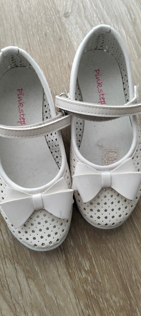 Beyaz renkli, fiyonklu ve yıldız desenli kauçuk kız çocuk babetleri. Pastel tonlarda, sade ve Pinkstep markalı. 29no