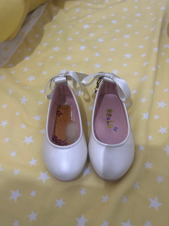 Beyaz renk, fiyonklu kız çocuk babeti. Düz ve yumuşak tabanlı, pastel tonlarda, Gaala markalı. Sadece ayakkabının bir tanesinin içi kayboldu onun dışında hiçbir sorunu yok