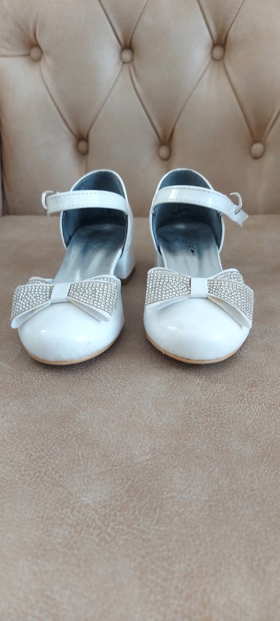 Beyaz renkli, fiyonklu ve bilekten bantlı kız çocuk babet ayakkabısı. Güncel tasarımlı, rahat kauçuk tabanlı şık model. Nağcık kilidi farklıdır (4-5.foto)