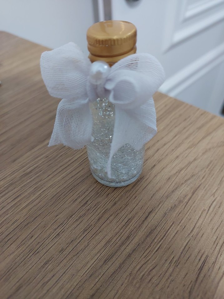 İçi parlak malzemeyle dolu, üzerinde inci detaylı beyaz kumaş fiyonk bulunan küçük hediye şişesi. Kapak altın rengindedir. Nikahım için almıştım. Elimde fazla kaldı. Poşet içerisinde durmaktadırlar hiçbir zarar görmemişlerdir. Üzerine sadece isim etiketi yapıştırılacaktır. 15 adet