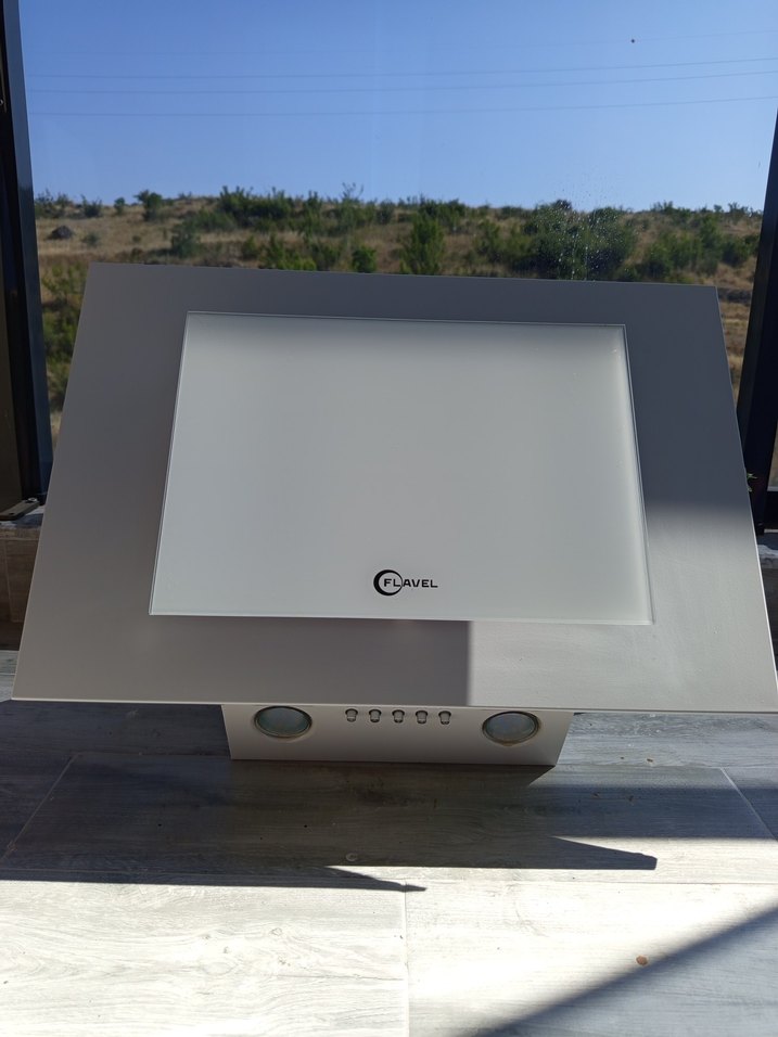 Beyaz renkte, altında kontrol düğmeleri bulunan Flavel marka monitör. Düzgün ve sade tasarıma sahip.