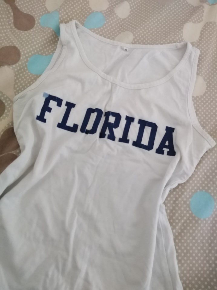 Pamuklu, beyaz, baskılı "FLORIDA" yazılı, kolsuz ve askısız, spor tarzda dar kesim kadın atlet. ♀️