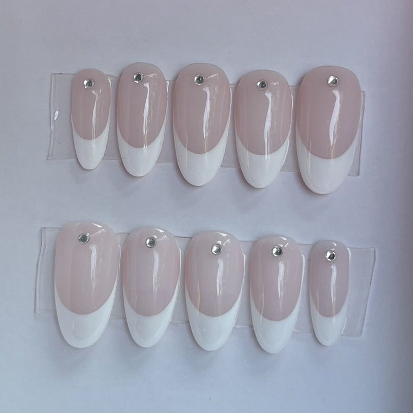 Ürünün içinde törpü+yapıştırıcı+tırnak eti itici hediye Açık renk taban üzerinde beyaz Fransız tırnak süsleri, her biri küçük bir taş ile süslenmiştir.