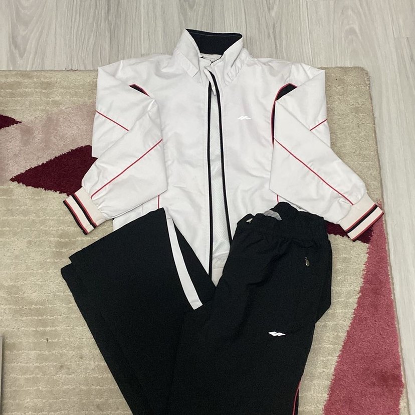 Fermuarlı, uzun kollu beyaz üst ve füme pantolonlu kadın eşofman takımı. 10-12 yaş çocuklara uygundur ya da 40 kg civarında birilerine rahat olur. En fazla 5 kez falan giyilmiştir, aynısının hiç giyilmemiş s bedeni de vardır.