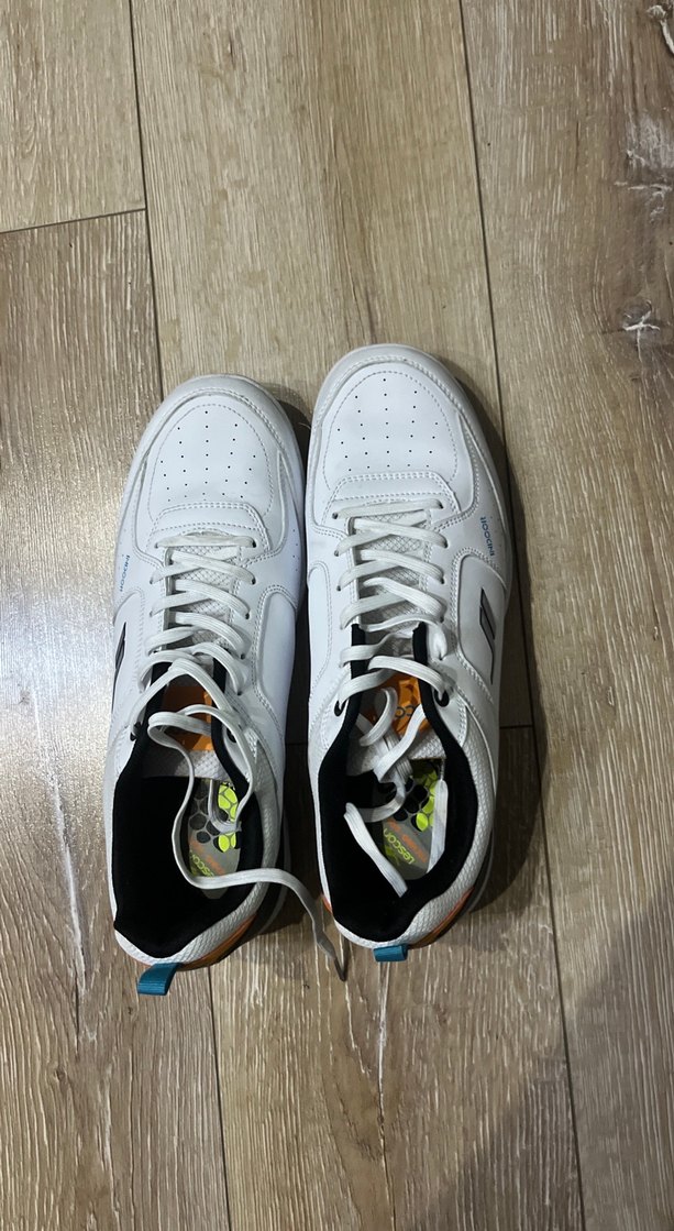 Beyaz spor ayakkabı, gri yılan desenli detaylar ve ince topuklu tasarıma sahip. Velcro kapama ile pratik kullanımlı, trend sokak stiline uygun.