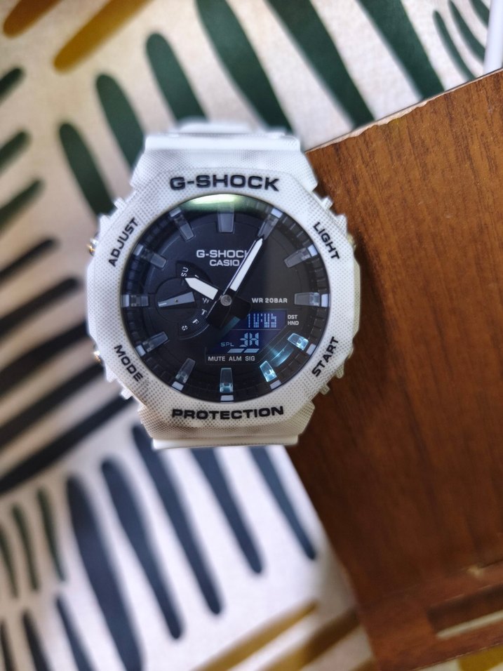 Beyaz renkli G-Shock erkek saat, siyah kadran ve renkli detaylara sahip. Dijital ve analog göstergeleri, koruma ve su geçirmezlik sunar. ⌚