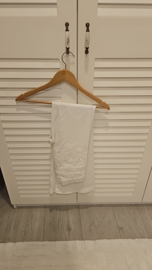 Pantolon veya diğer kıyafetleri düzenli tutmak için tasarlanmış beyaz, ahşap gardırop düzenleyici askı.