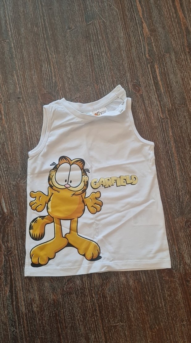 Yumuşak kumaştan beyaz, kolsuz çocuk atlet. Üzerinde büyük Garfield baskısı ve yazısı bulunur.