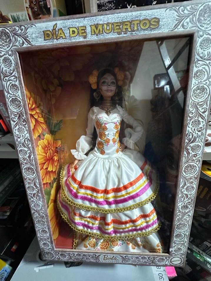 Bu beyaz bebek, turuncu ve pembe detaylarla süslü geleneksel bir elbise giymektedir. Día de Muertos temasını yansıtan detaylı kutuda sunulur.