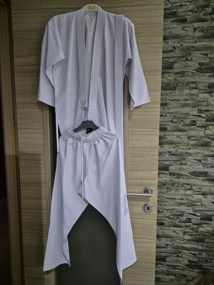 Beyaz ve gri renkte, desensiz geleneksel tarzda bornoz ve şalvardan oluşur, rahat ve sade bir tasarıma sahiptir.