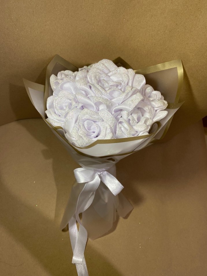 beyaz çiçeklerden oluşan gelin buketi, şeffaf kağıt ve saten kurdele ile sarılmış. Eni 15-20 cm boy 25-30cm
