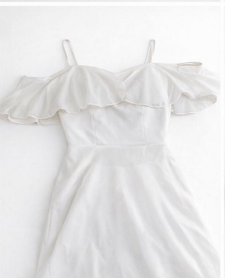 Beyaz gelinlik, straplez yaka ve ince askılı kollara sahiptir. Modern klasik tarzda, şık ve hafif görünümlüdür.