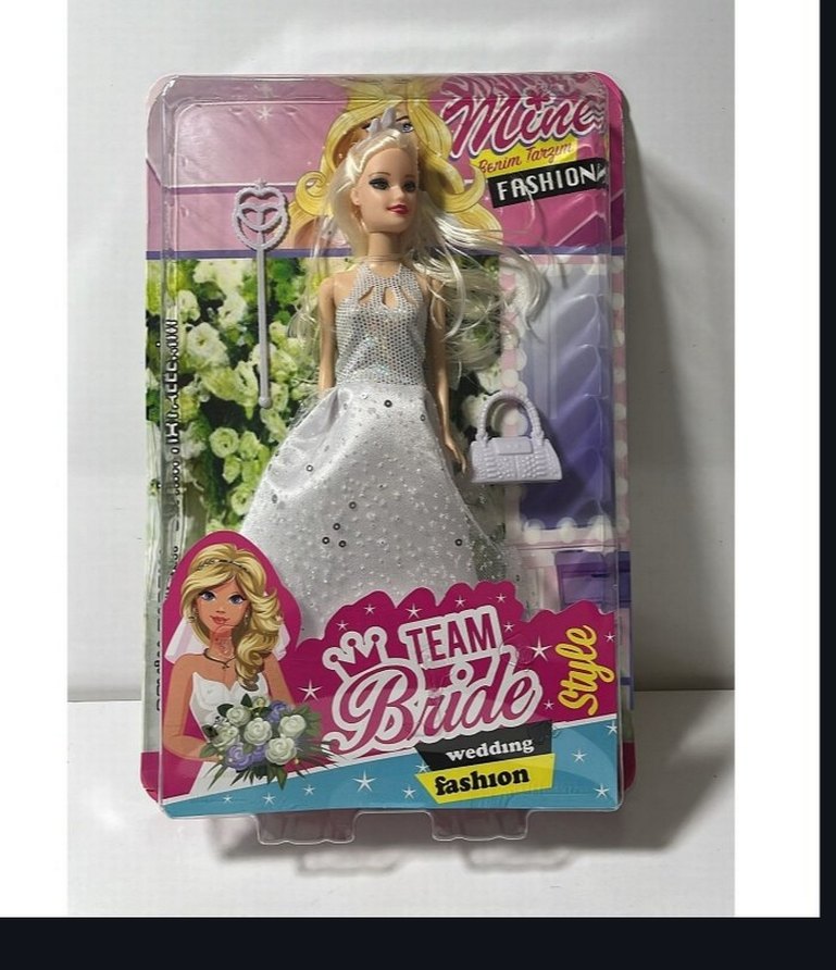 Uzun sarı saçlı bebek, beyaz gelinlik ve aksesuar olarak küçük bir çanta ile birlikte gelir. Şık ve zarif tasarıma sahiptir.