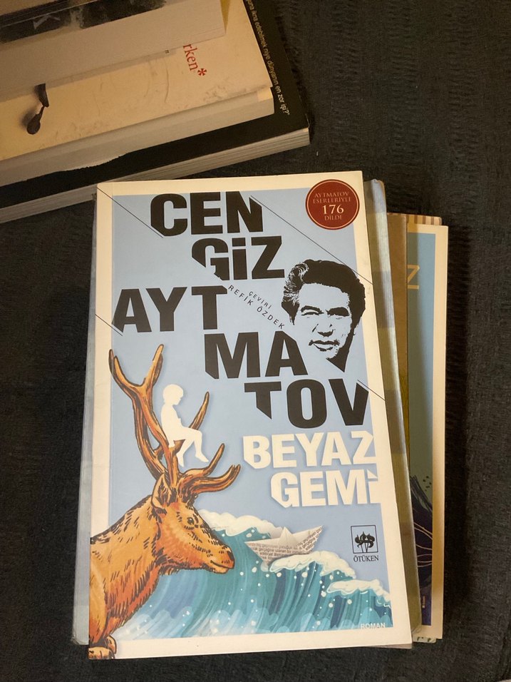 Cengiz Aytmatov'un "Beyaz Gemi" romanı, geyik, kağıt gemi ve yazar portresiyle simgesel bir kapağa sahip.