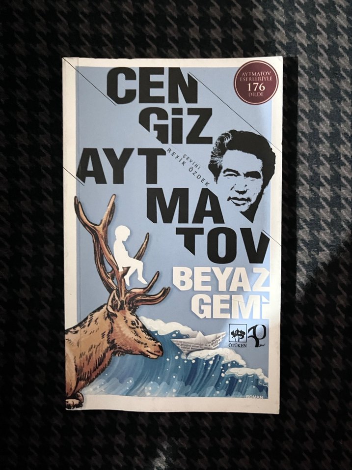 Cengiz Aytmatov'un "Beyaz Gemi" romanı, anlamlı temalarla şiirsel bir anlatı sunar. Kapakta geyik ve çocuk figürü bulunur.