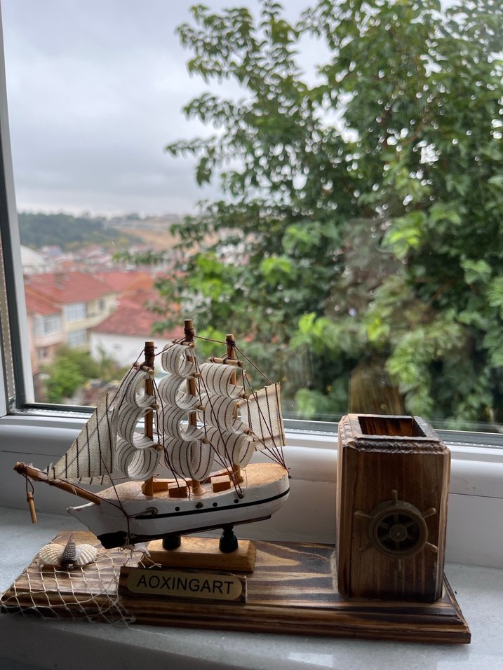 beyaz ve gri renklerde detaylı yelkenli gemi figürü, ahşap taban üzerinde ve gemi dümeni detaylı kalemlik ile birlikte. ⚓ dolabımda duruyordu süs diye .