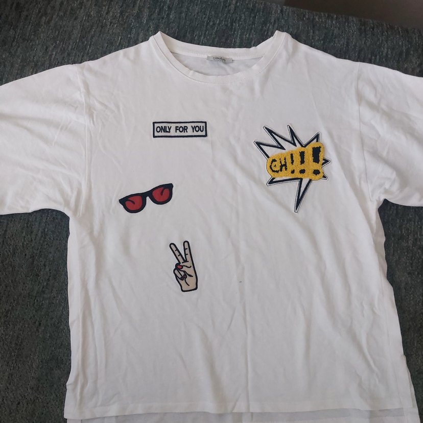 Beyaz pamuk genç kız tişörtü, kısa kollu ve bol kesim. Düğmeli detaylı, "ONLY FOR YOU" ve "CH!!!" baskılı grafikler içerir. Rahat sokak stili, yuvarlak yaka.
