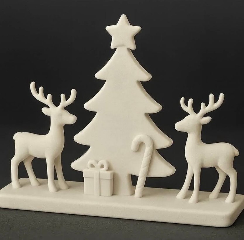 Beyaz renkte yılbaşı temalı biblo seti; çam ağacı, iki geyik, hediye kutusu ve şeker çubuğu detayları bulunuyor. 3D yazıcı ile üretilmiştir. #çamağacı #noel #geyik #yeniyıl # yılbaşı