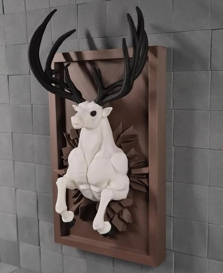 Koyu renk boynuzlu beyaz geyik figürü, duvara monte edilmiş kahverengi çerçeveden çıkıyormuş gibi tasarlanmıştır.