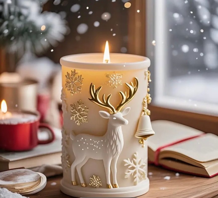 Farklı tasarımı ile Altın detaylı geyik kabartmalı beyaz mum, sıcak ve şık bir atmosfer sağlar. ️