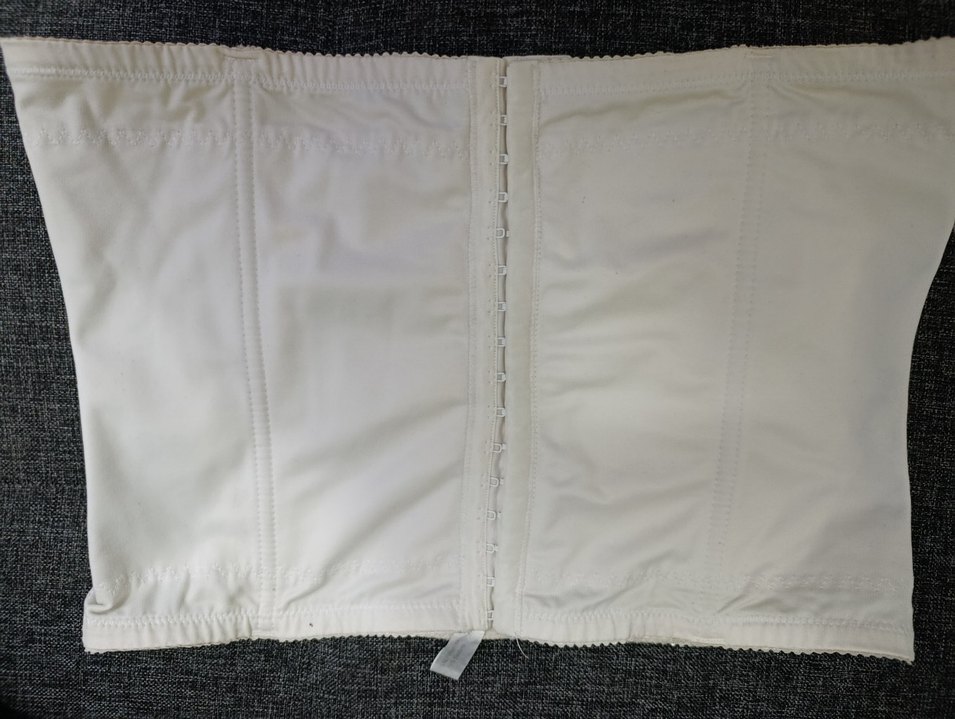 Beyaz renkte, midi boyda ve önü çıtçıtlı, rahat ve destekleyici göğüs körüklü fitted korsedir. 2 adet
