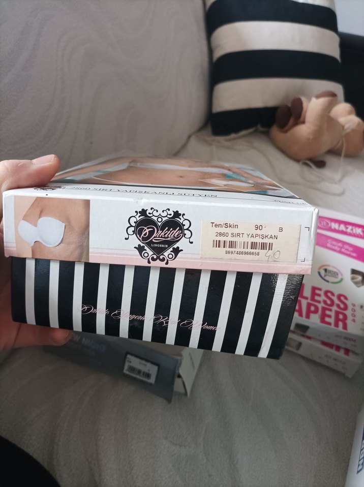 Ten renginde beyaz göğüs pedleri, 90 B beden, emzirme sırasında konfor ve koruma sağlar. Paket üzerinde kolay tanımlama için etiket bulunmaktadır.