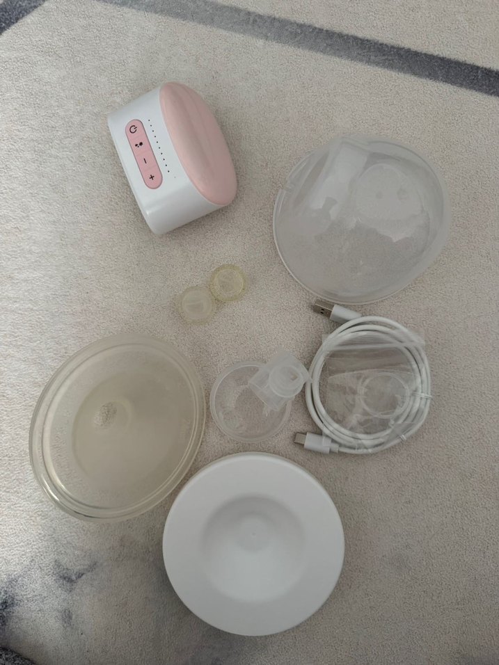 Beyaz göğüs pompası seti, açık pembe kontrol ünitesi, çeşitli aparatlar ve USB kablosu ile kullanıma hazır. Çok az kullanım yaptım. Kablosuz şarjlı. Tüm parçaları mevcut.