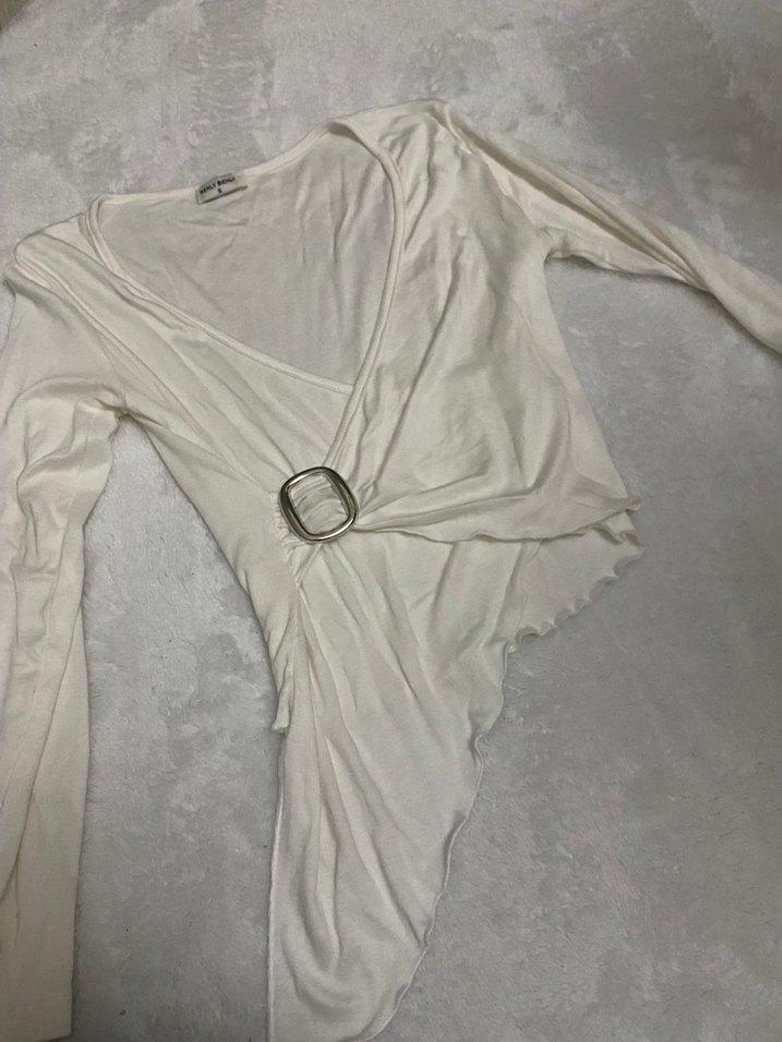 Beyaz uzun kollu bluz, v yaka ve kemer detayına sahip drapeli ve dar kesimlidir. Midi boyda, minimalist sokak stili için uygundur.