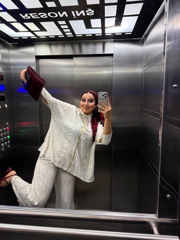 Beyaz, salaş kesim, midi boy takım, ipeksi dokulu, transparan ve batik desenlidir. Uzun kollu, halter yaka tasarıma sahiptir. Günlük kullanım için uygundur.