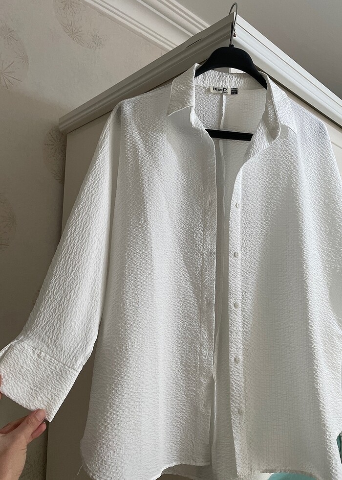 Hafif dokulu kumas kadın beyaz gömlek. Sayılı kullanılmıştır tertemiz ve dofosuzdur