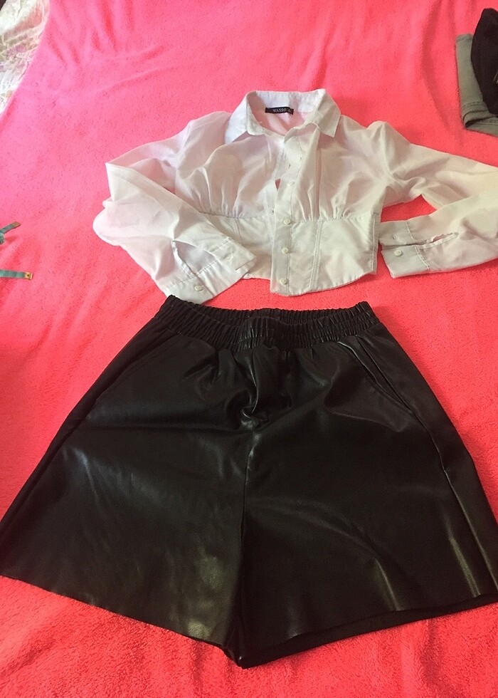 Beyaz gömlek ve siyah deri şort