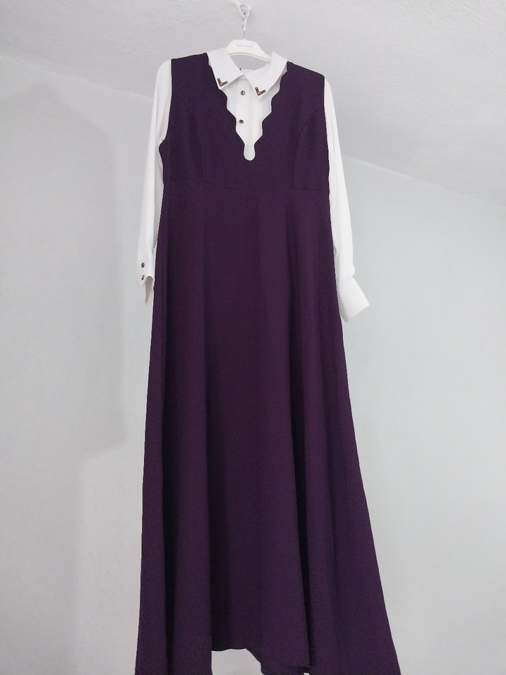 Mor renkte, V yakalı ve kolsuz uzun elbise ve beyaz gömlek. Gömlek ve elbise ayrı. Gömleğin düğmeleri dekoratif