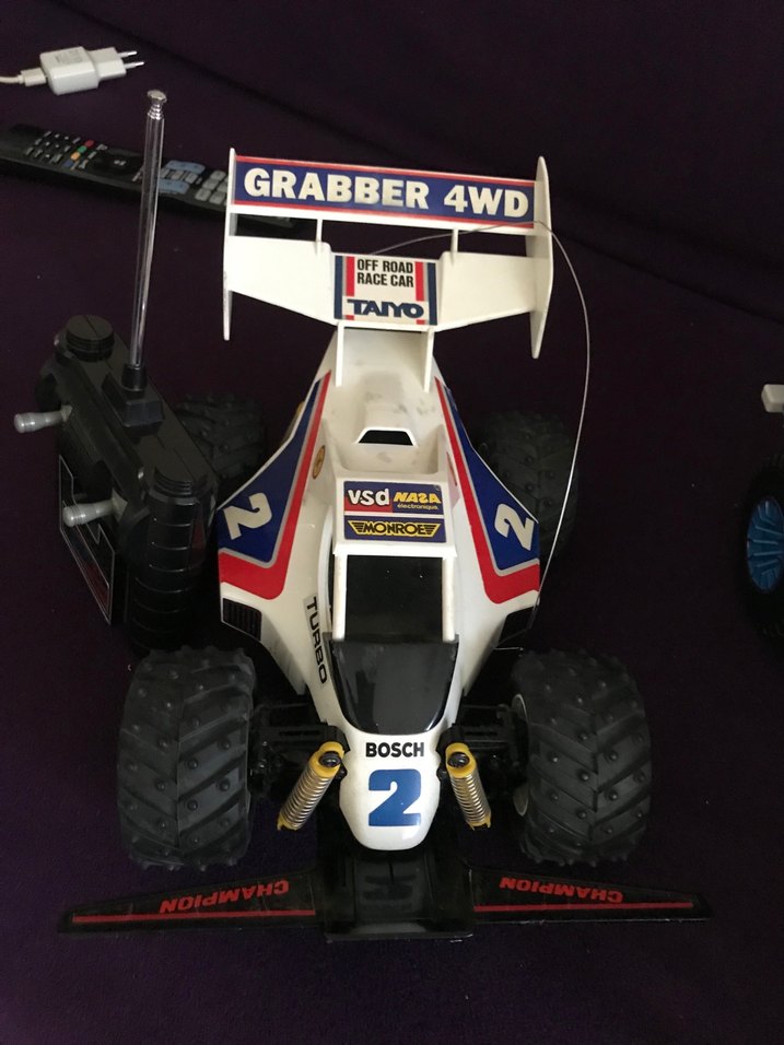Beyaz Grabber 4WD oyuncak araba, off-road tasarıma ve BOSCH, TATYO logolu detaylı çıkartmalara sahip. Büyük, dayanıklı lastiklerle donatılmış.
