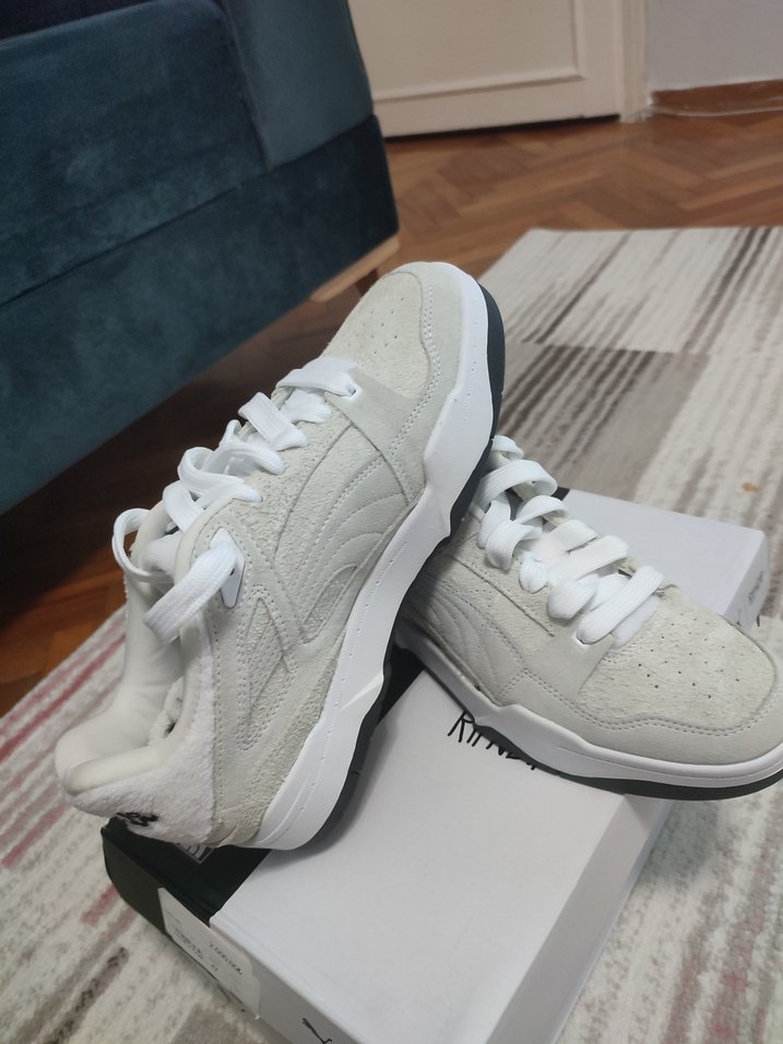 iki bağcıklı beyazla krem puma Orjinal magzadan alındı yanlrida küçük parçalar mevcuttur resimde belirtmiştim alana hayırlı olsun 40.5 çok sağlam taş gibi