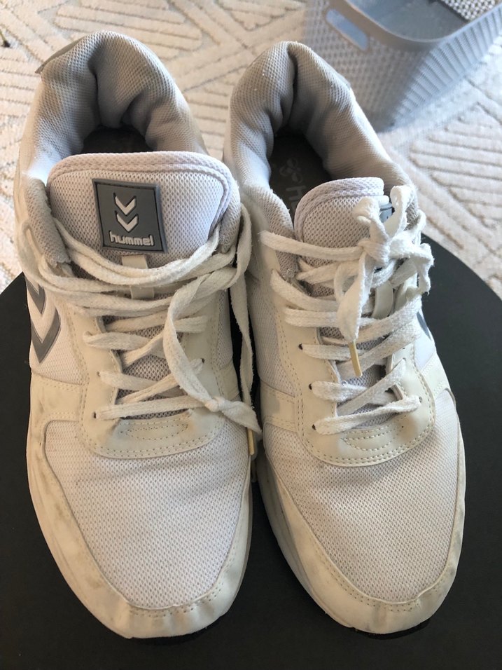 Beyaz ve gri renklerde, bağcıklı, düz tabanlı ve kauçuk malzemeden kadın spor ayakkabısı.