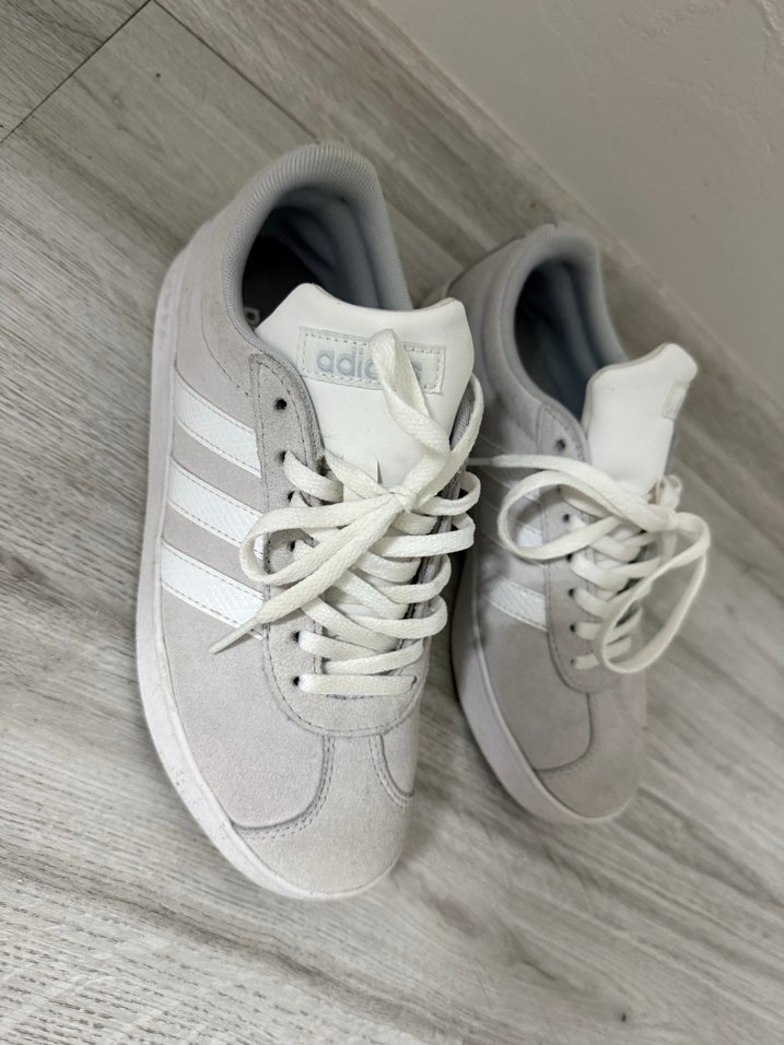 Beyaz ve gri tonlarda, bağcıklı tasarıma ve düz tabana sahip kadın spor ayakkabısı, spor ve sokak stili için uygundur.