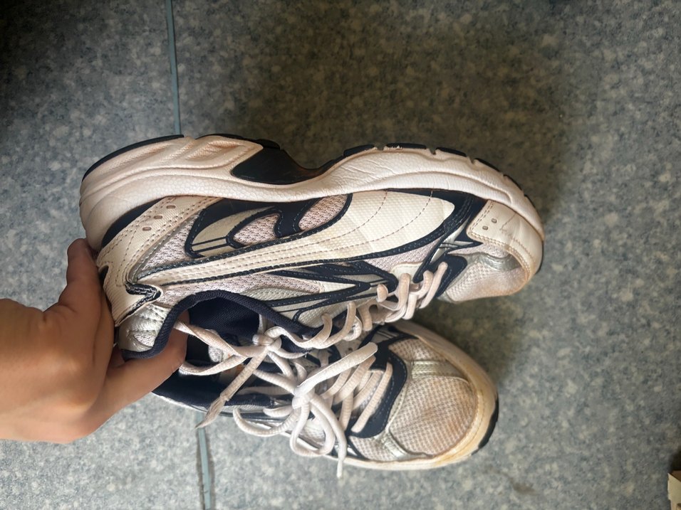 Beyaz ve gri renklerde, bağcıklı, ince topuklu kadın spor ayakkabısı. Kauçuk malzemeden, spor ve sokak stiline uygun, desen içermeyen tasarım.