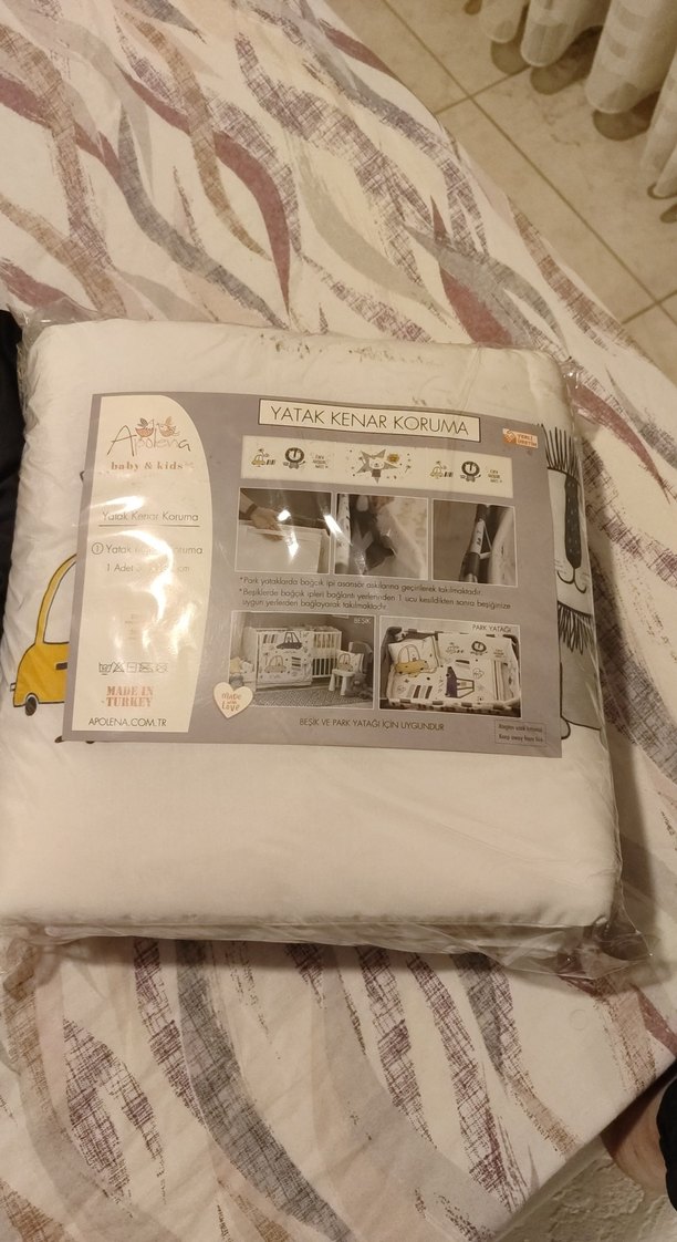 Gri ve beyaz baskılı, yumuşak sentetik kumaştan yapılmış bebek yatak kenar koruma. Güvenli uyku için kenar koruması sağlar.