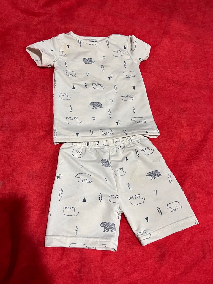 Kısa kollu, bisiklet yaka, baskılı desenli beyaz gri erkek bebek takımı. Yumuşak ve sıcak kumaştan üretilmiştir.