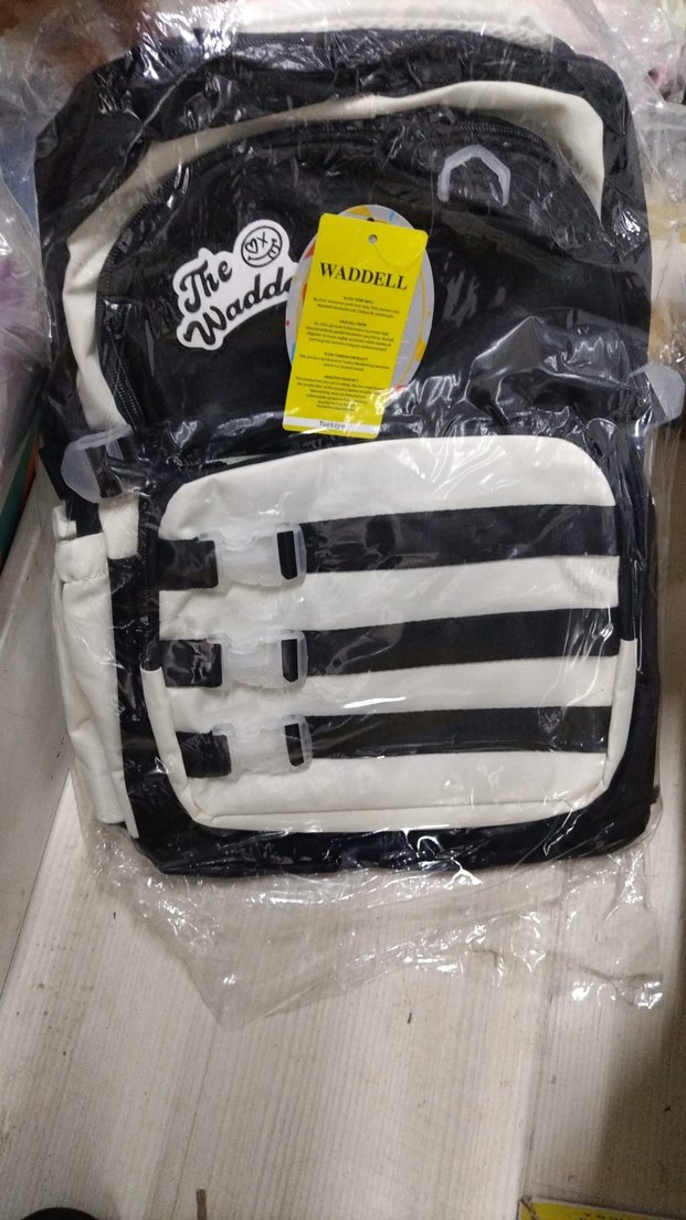 Beyaz ve gri tonlarda baskılı, tokalı kayışlara sahip erkek sırt çantası. 'The Waddell' etiketi bulunur, sokak tarzına uygundur.
