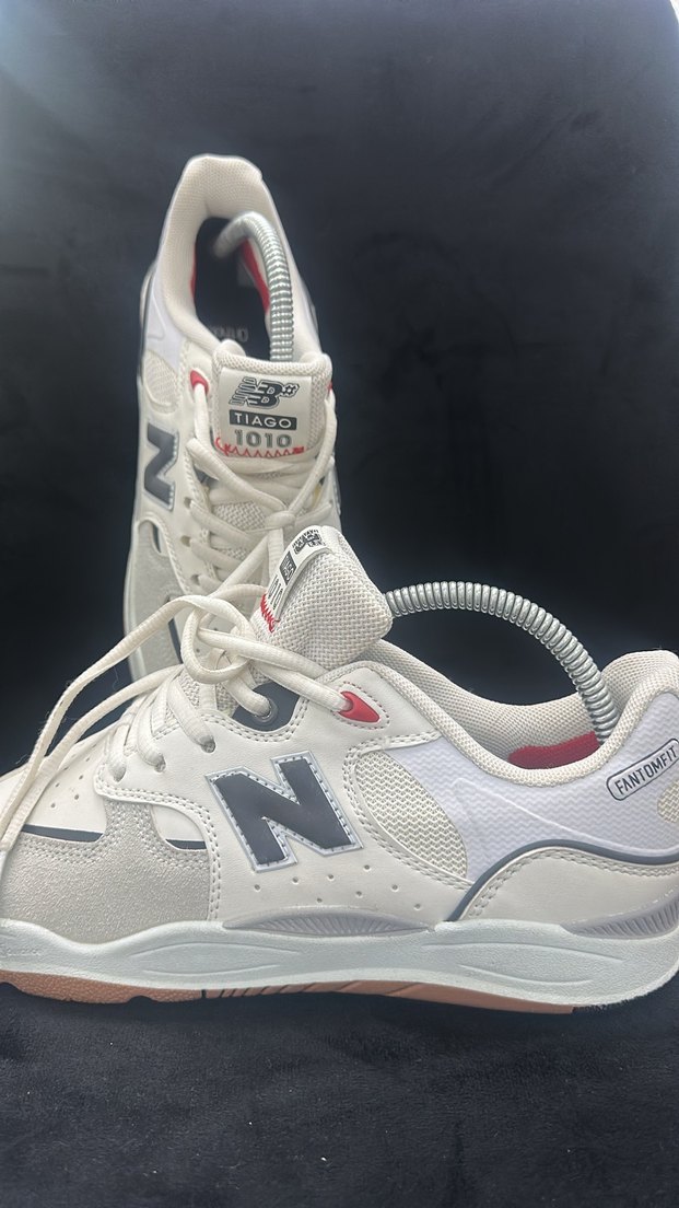 Beyaz ve gri baskılı, düz tabanlı kadın spor ayakkabısı. 'TIAGO 1010' detaylarına sahip, rahat kauçuk malzeme kullanılmıştır. Trendy casual sokak stili için uygundur. 1 tane 42 New balance tiago 1010 Orjinal fantomfit