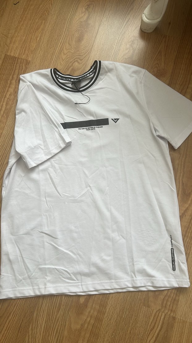 Pamuklu kumaştan, beyaz renkte, gri baskılı, salaş kesim, kısa kollu erkek tişört. Spor ve rahat stil için uygundur. ️