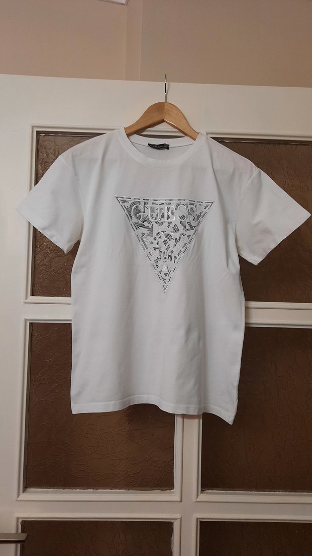Önü gri üçgen baskılı beyaz kadın tişörtü. Pamuklu, kısa kollu, yuvarlak yaka ve bol kesimle rahat bir sokak stili sunar. iki koltuk altı 48 cm. Boyu 64 cm.
